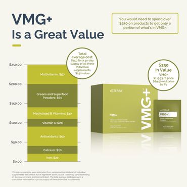 VMG+ Whole-Food Nutrient Complex is an advanced, all-in-one daily nutritional powdered drink designed to optimize foundational wellness and tastes great. It features over 90 high-quality ingredients, including whole-food vitamins and minerals, fruits, vegetables, digestive enzymes, probiotics, CPTG Certified Pure Tested Grade® essential oils, and other beneficial nutrients. This clean, vegan, and gluten-free formula delivers essential macro- and micronutrients that the body relies upon to support daily energy levels, immune system function, gut health and digestion, liver function, hormone function, and brain function.*